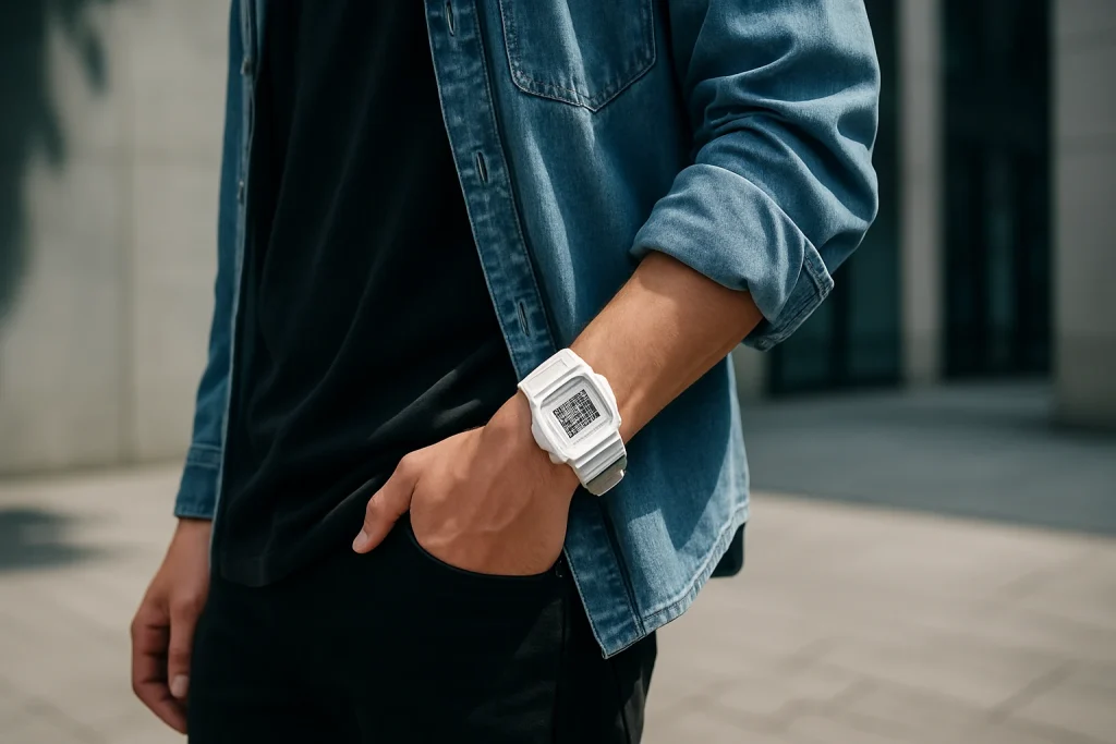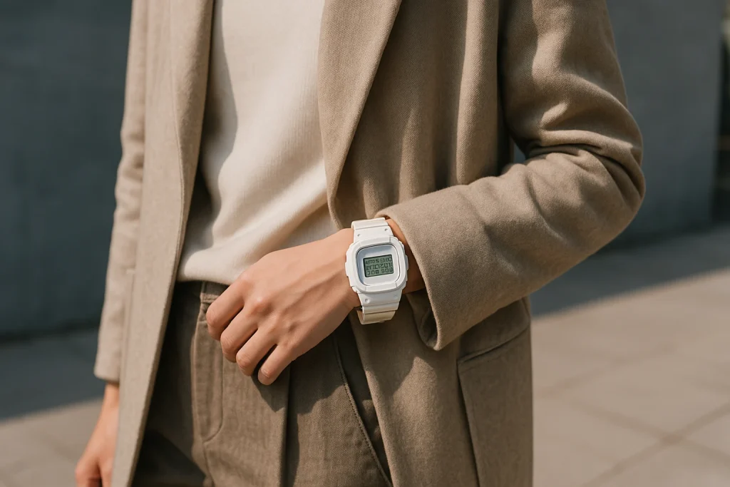 つまり、白G-SHOCKをおしゃれに見せるコツは、「他のアイテムの色と質感をどう調整するか」にあります。服装全体の中で時計が浮かないように、素材感と明度をコントロールするだけで、印象は劇的に変わります。