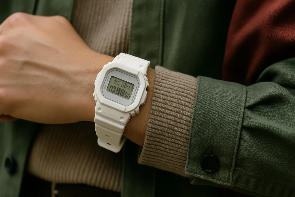 このギャップは、使う人のファッションスタイルや生活シーンによって見え方がまったく違うからなんです。ストリートやカジュアル系の服装が多い人には白G-SHOCKがしっくり馴染みますし、アウトドア派の人にとっては「汚れを気にせず使える軽快な時計」として実用的です。