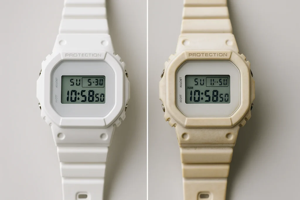 これは避けて通れないテーマです。白はどうしても時間とともに汚れが目立ちやすく、特に樹脂バンドのモデルでは、皮脂や汗、紫外線の影響を受けて黄ばみが進行します。最初はピュアホワイトでかっこよくても、数ヶ月経つと「ちょっとくすんでるかも…」と感じる人も多いはずです。