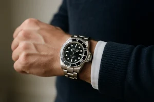 色の主張が強い時計を自然に見せるコツは、他のアイテムの色数を減らすことと、肌に近いところをシンプルにすることです。白シャツや黒のハイゲージニットと組み合わせると、青やカットの輝きが一気に上品寄りに見えますよ。